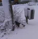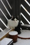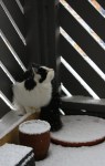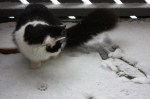 Katla var ute på balkongen förut idag och det snöar riktigt mycket! Det är tak över balkongen så det kommer inte in så mycket snö dit, men lite iallafall. Katla satt och stirrade på den en stund och sedan slängde vi ut en leksak till honom och då blev det lite mer fart på honom =) Han upptäckte att det var roligt att dra tassen genom snön så det bildades en liten boll! Sötis.
