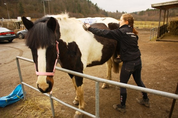 Jag och Axel var i stallet vid niotiden idag för att försöka få hästen lite ren inför morgonens aktiviteter. Det var ju idag som Havrepappa skulle hoppa med Alice. Egentligen visste jag att Alice skulle ha tappat sin ena sko idag, igår satt den nämligen lite löst då hon hade trampat på den så att den böjt sig lite. Men jag bankade lite på den och hoppades att det skulle sitta, bara en dag till! Men icke, när jag hämtade Alice i hagen hade hon bara tre skor på sig.