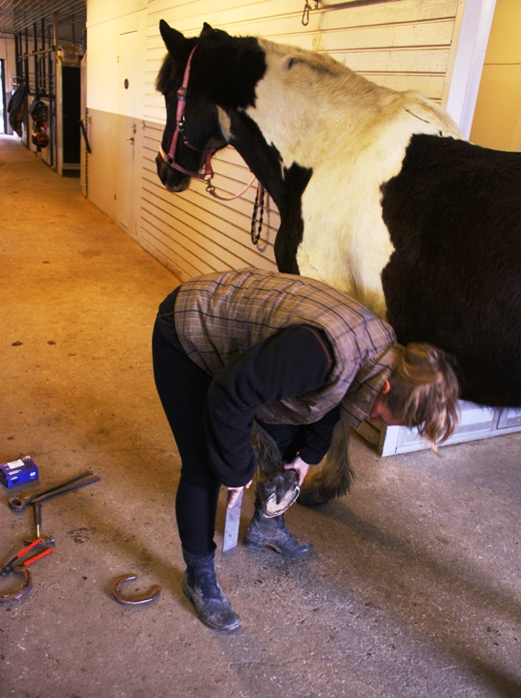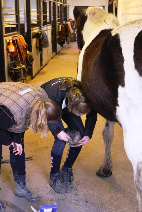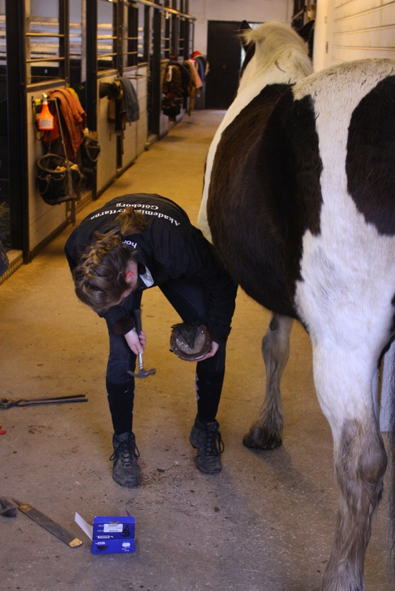 Turligt nog är vår fantastiska stallägare bra på att slå på tappskor så jag ringde upp till henne och bad om hjälp. Rotade fram lite gamla dojor och den ena såg ut att passa riktigt bra. Sofia fixade till hoven lite och började sedan sätta dit skon.