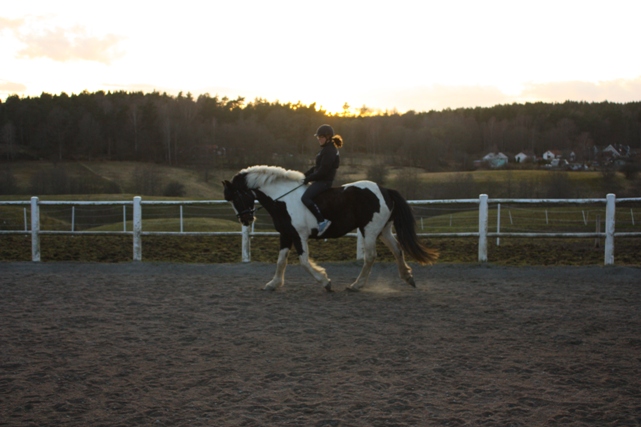 Efter insläppet fixade vi hästarnas frukost och gjorde i ordning Alice för lite ridning på banan. Det var härligt nog fortfarande ljust ute! Red lite barbacka-dressyr på banan fast vare sig jag eller Alice var helt på dressyrhumör idag. Hon var väldigt pigg så jag passade på att träna galopp-trav-galopp-trav och även skritt i stället för trav, vilket gick ganska bra.