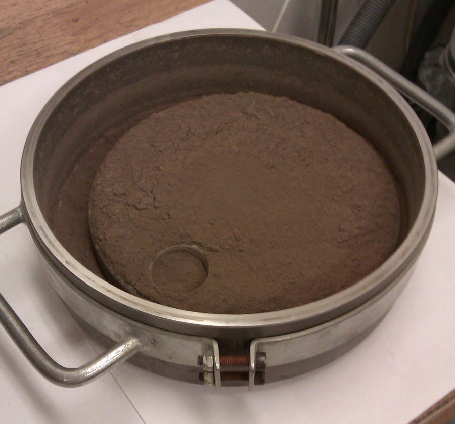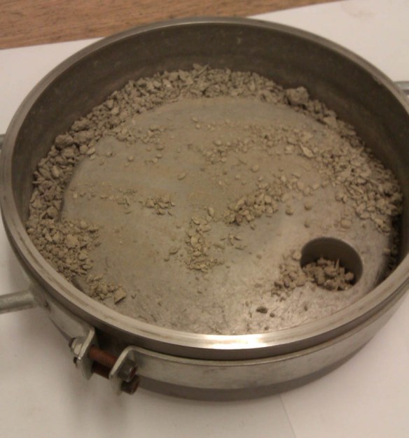 För den första malningen använde jag ett så kallat malfat som finns djupt nere i skolans källare. Provet hälls i fatet, ett lock sätts på och så sätter man in fatet i en sorts maskin som skakar och snurrar fatet i några minuter, tills provet har pulveriserats.