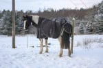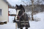 Alice var varm och go i sitt täcke och fick äta lite hö medan jag mockade lösdriften. Lite klurigare nu där det är snö och kallt ute, men jag fick bort det mesta iallafall.