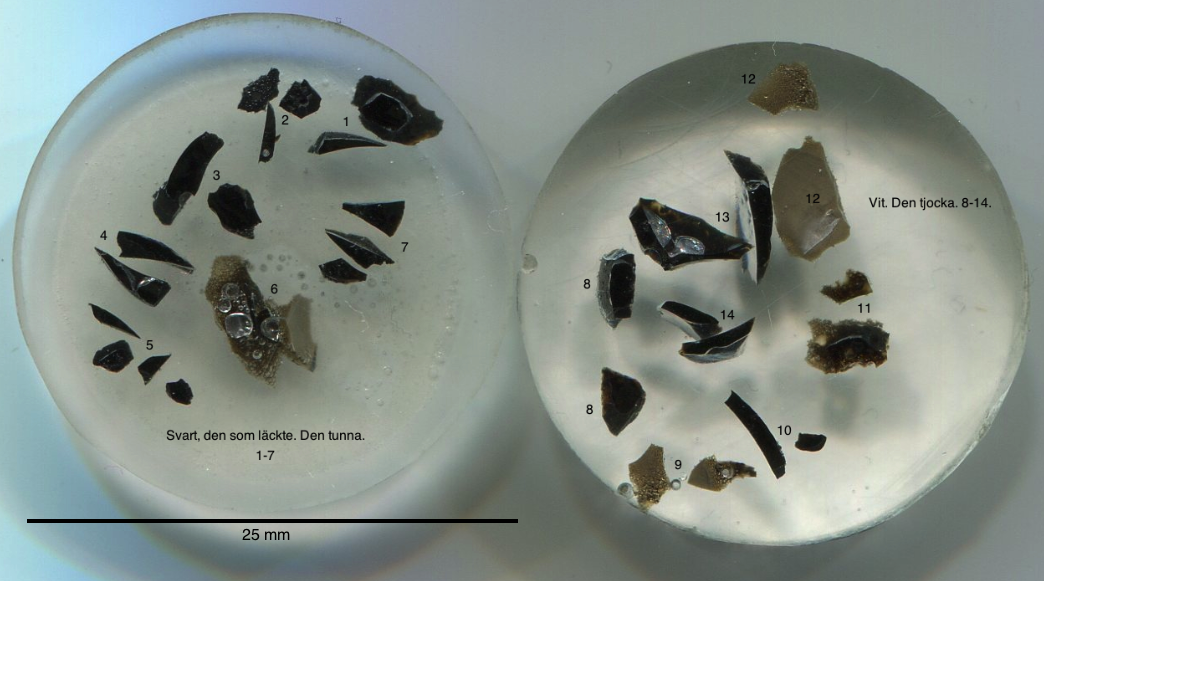 När poleringen var färdig tvättade jag dem och fotade dem så att jag kunde märka upp vilka skärvor som hör till vilket prov. När jag sedan sitter vid SEM:en och analyserar är det ju bra att se vilket prov jag håller på med =)
