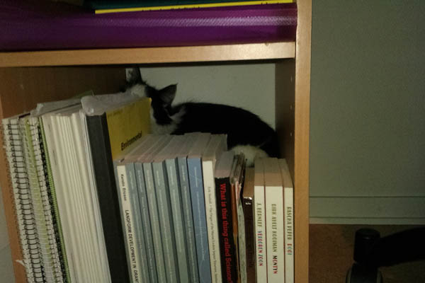 Till slut råkade Axel titta in i skrivbordet, bakom böckerna, och där inne på det mest obekväma sättet låg det en fluffig katt inträngd. Knas-katt.