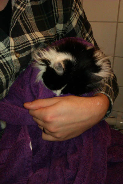 Idag gjorde vi proceduren i badrummet, av den enkla anledningen att det är enklast att städa där inne! Ibland hamnar maskmedlet lite överallt, förutom i munnen på katten. Idag lyckades vi ändå ganska bra, men det är en väldigt stark och slingrig katt vi har.