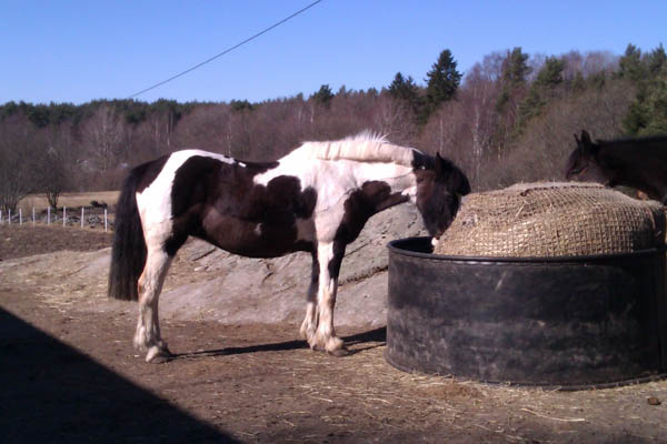 Nu har föresten även ”stall-hästarna” matlådor ute i hagarna. De får fortfarande frukost men nu har de även en sån här tunna att pyssla med resten av dagen om de får tråkigt. På bild är C-ponnyerna Jocke och Nemo.