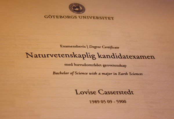 Tre års slit har resulterat i fina papper med fina resultat! Nu är det bara några månader kvar innan jag kan ansöka om examen för mastern också, men den får ju bli klar först!