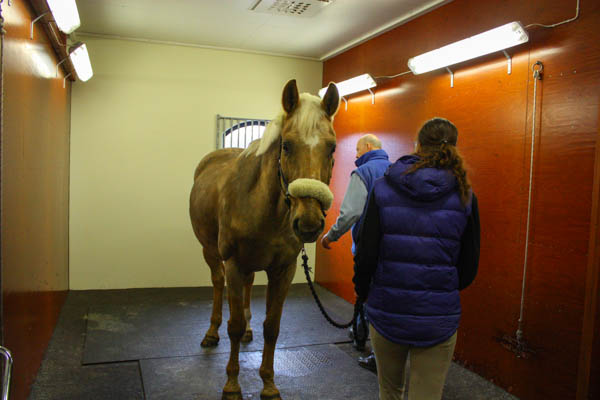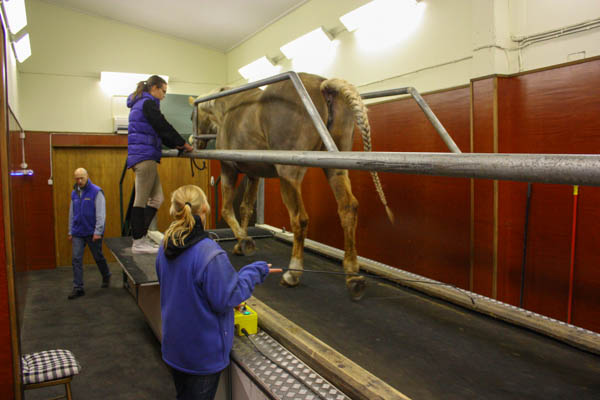 Vi gick då till klinikens rullband som används för att lokalisera hästens skada. Blondie gick smidigt upp på rullbandet som snart gick i en hastighet så hon var tvungen att trava. Veterinären kunde då gå runt den travande hästen och kika från alla olika håll och kanter på hennes rörelsemönster. Rullbandet var mestadels plant men under en kort sekvens lutade det uppför så att Blondie fick trava i en uppförsbacke och då ta i lite mer med bakbenen. Väldigt intressant att se!
