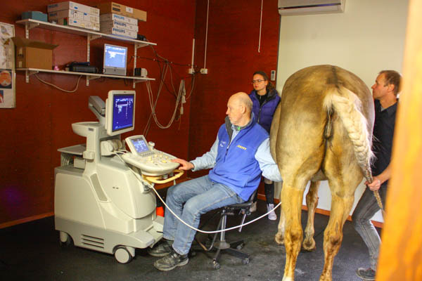 Blondie fick nu lugnande medel och leddes sedan in i ett mindre rum där veterinären undersökte hennes skadade ben med ultraljud. Han hittade snart vad han sökte. Blondies yttre ledband vid knäet var skadat, hon hade inflammationer i ligamenten och muskeln som fäster i den, en liten blödning och så hade hon några sprickor i sin menisk. Lite värre än vad vi trodde alltså..