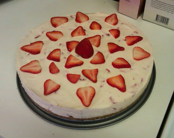 Väl hemma blev det dusch och sen hann jag nästan dekorera klart tårtan innan Axels två kompanjoner steg innanför dörren. De har ”möte” hemma hos oss idag så de fick offra sig på att hjälpa oss att äta upp tårtan som vi gjorde i går kväll. Ett holländskt recept på jordgubbscheesecake (typ) som blev riktigt lyckad! God och ganska fin!