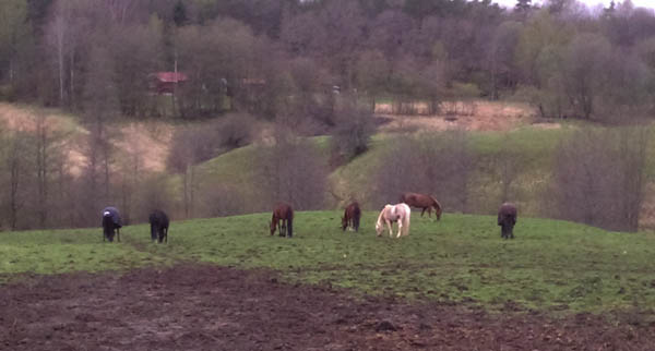Så när alla hästarna var utsläppta fick jag gå och plocka bajs ur alla boxar, stoppa i märkta påsar och sedan lägga i ett tjockt vadderat kuvert för att kunna skicka in det. Som tur är behövs det inte mycket per häst, men ett drygt kilo hamnade nog i kuvertet sammanlagt. Hästarna på lösdriften är ju lite svårare att ta träckprov på, man vet ju inte vilken hög som hör till vilken häst. Därför fick de hästägarna ta egna prov i går, som jag idag lade samman med de andra påsarna.