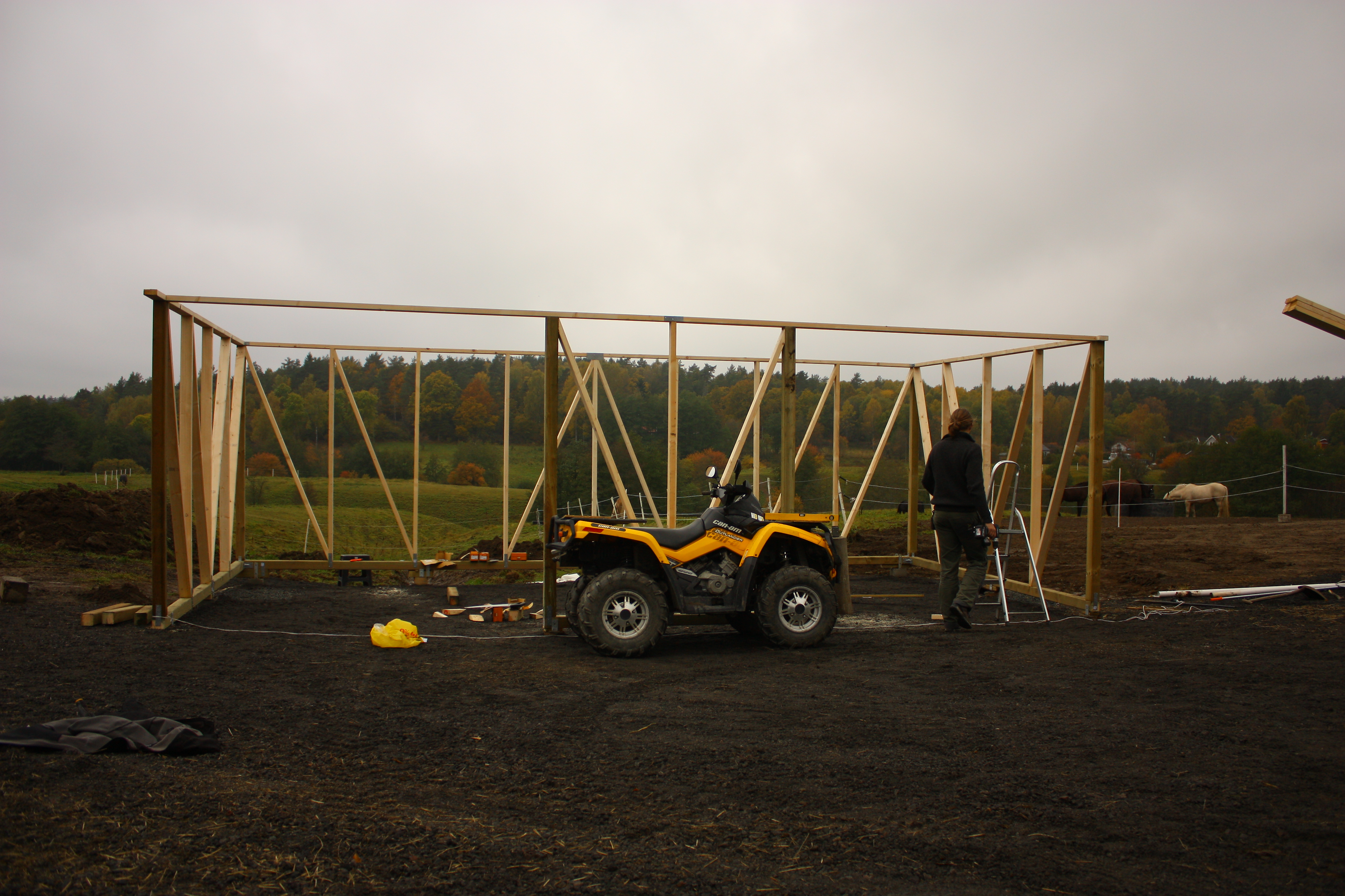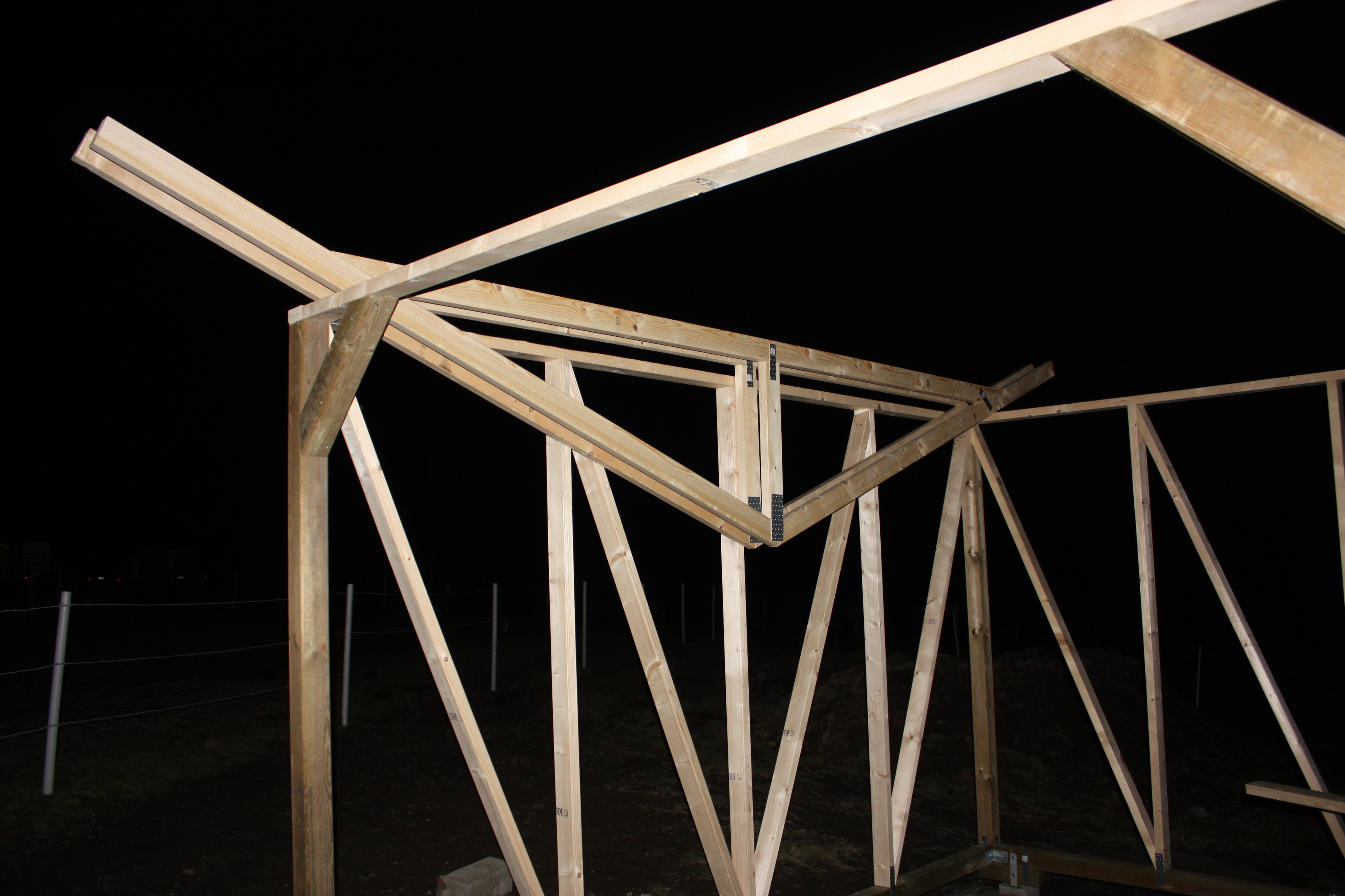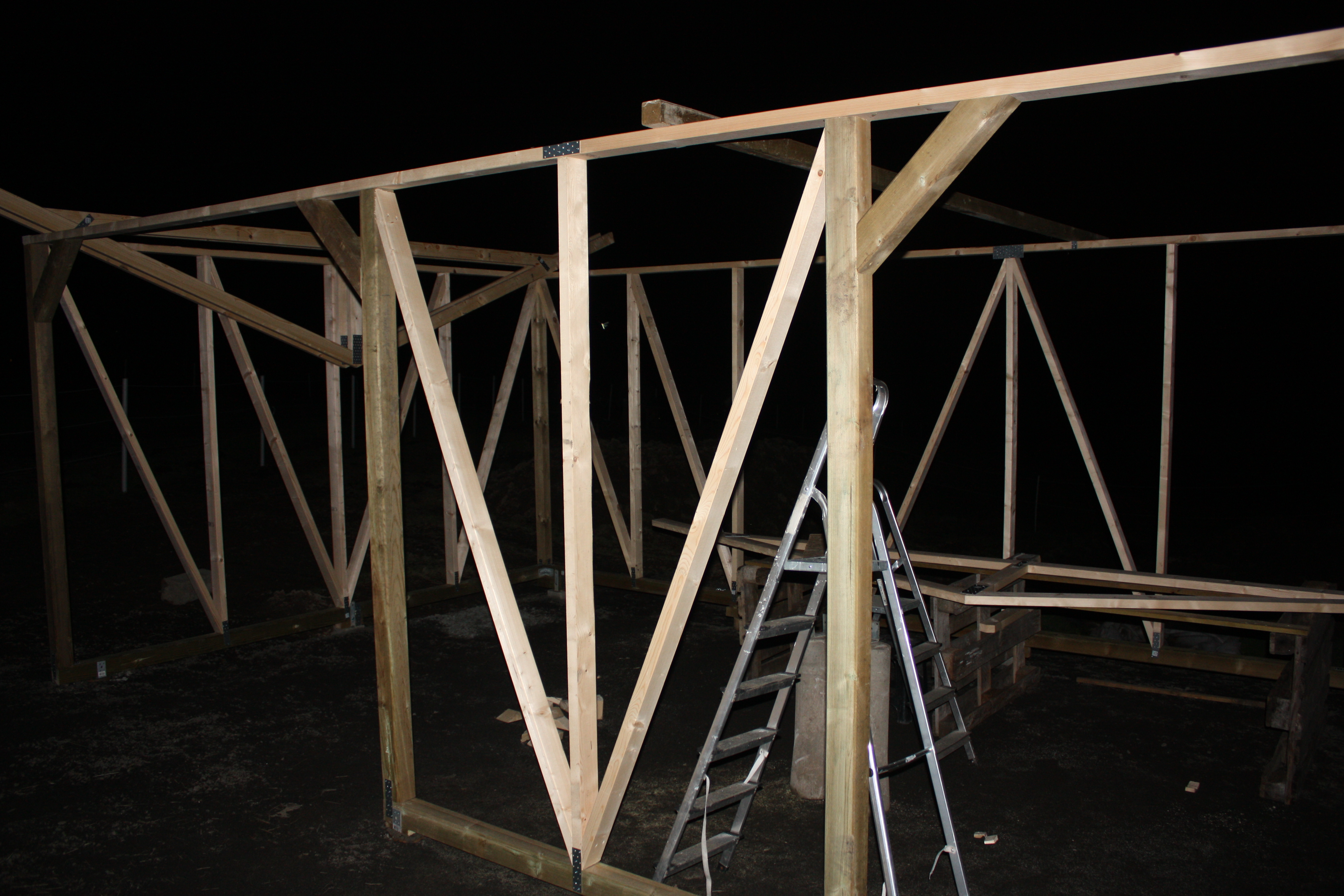 Mörkt blev det idag också. Här är vi klara för dagen, vi har hunnit sätta upp ”stödben” i öppningarna, gjort klart tre takstolar och handlat mer virke.