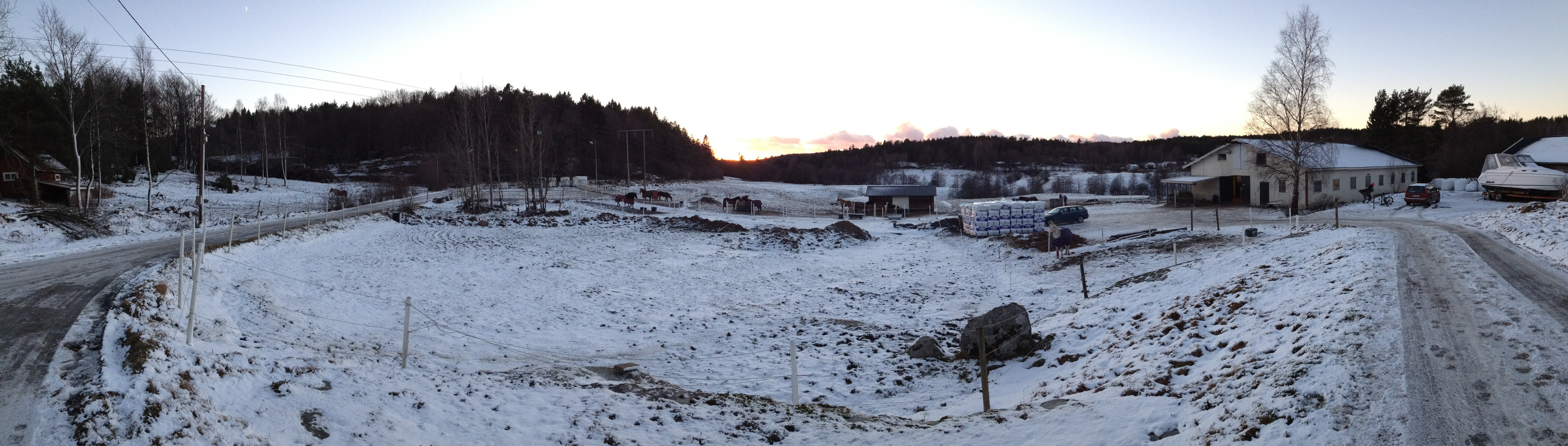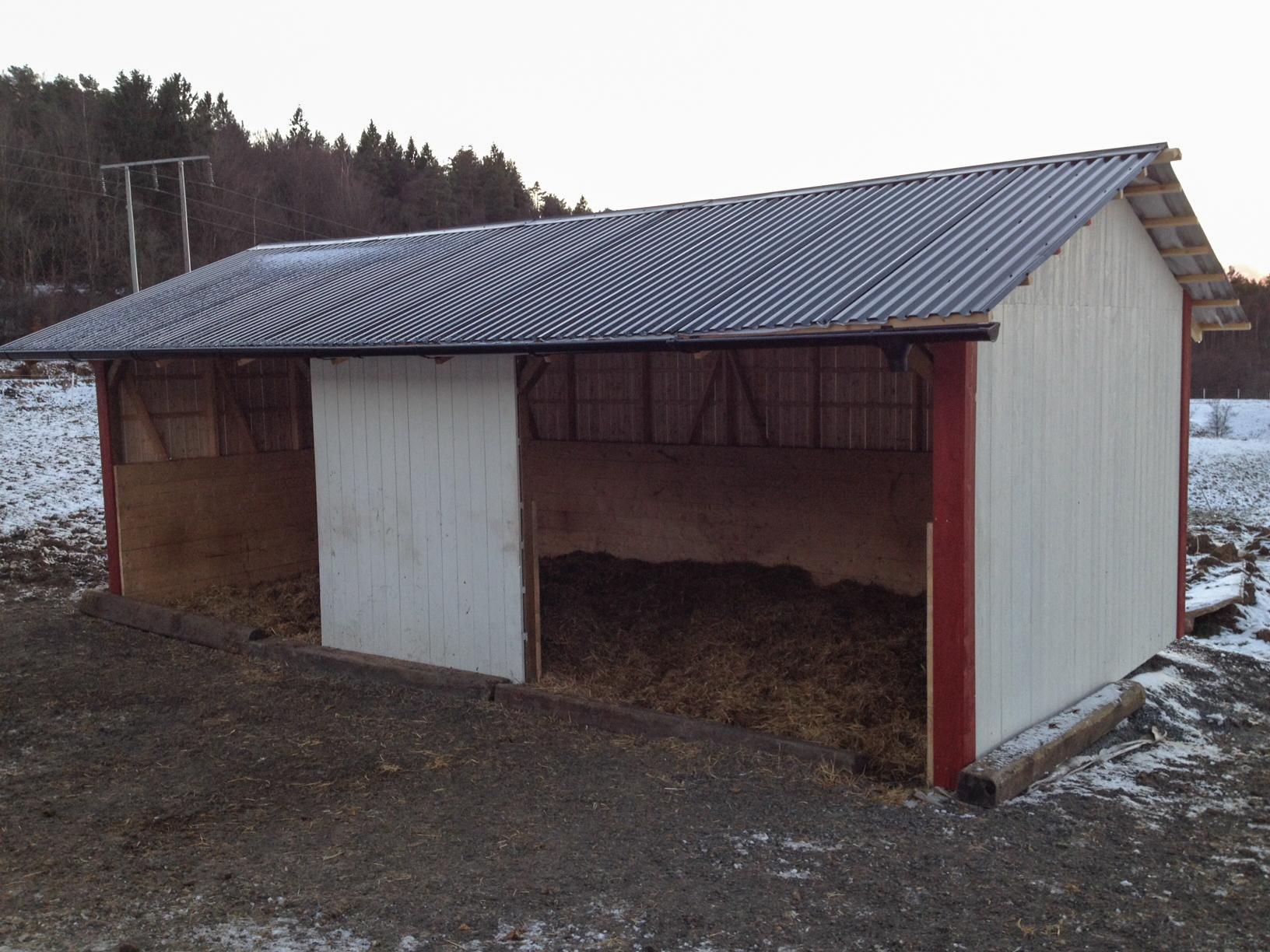 Som flera andra helger har vi idag lagt några timmars arbete på ligghallen i stallet, som klarade stormen Sven med bravur! Vi har nu satt på röda tjusiga knutar på huset, sågat av utstickande brädor på taket och lagt in resten av virket på loftet ovanför stallet.
