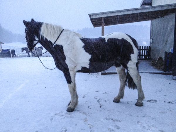 Sen fick Alice lite uppmärksamhet såklart, och vi gick ut ur stallet lagom till att det började snöa ordentligt. Mysigt! Liten skrittur blev det och Alice var pigg.