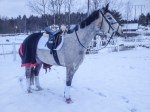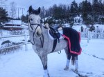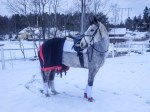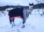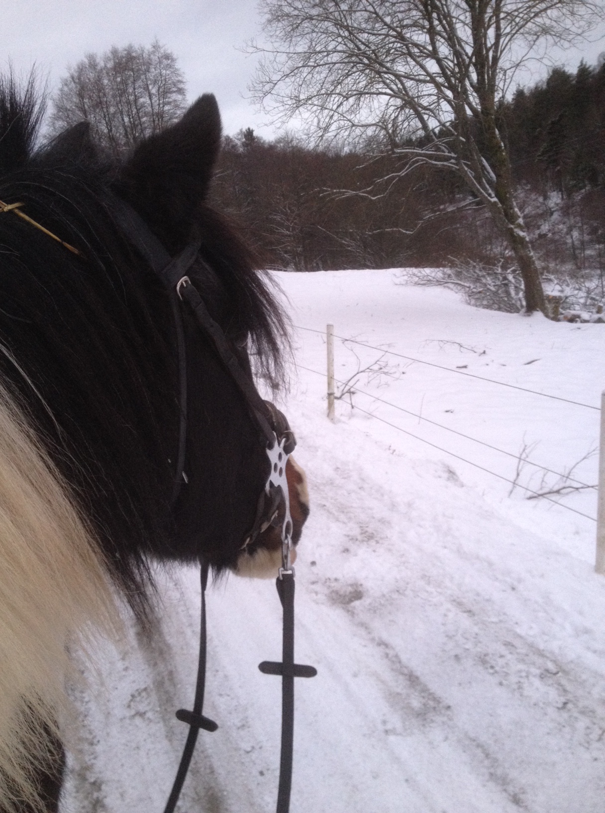 Alice är ju inte speciellt väderkänslig så jag började med henne. Jag sopade av henne snön, tog hovarna, tränsade och packade in oss båda i ett tjockt fleecetäcke. Barbacka såklart! Alice var lagom pigg bort från stallet och när vi vände hemåt blev hon superpigg. Så fort jag plockade upp tyglarna dansade hon på tvären, snön yrde kring hovarna och hon frustade om och om igen. När vi närmade oss en svag uppförsbacke gick det inte riktigt att hålla henne längre utan hon fick fräsa iväg i galopp; nästan ljudlöst över den snötäckta marken. Det är precis såhär vintern ska vara! =)