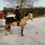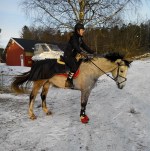 Idag hade jag två hästar att rida så jag och Susanne bestämde i går kväll att vi skulle rida ut tillsammans i det underbara vädret! Jag minns inte alls när vi red ut senast, och Susanne kunde nästan inte komma i håg när hon red senast över huvud taget! Men troligtvis för kanske fem-sex månader sen ungefär, när hon var i sjunde månaden med lille Oliver. Solen sken, hästarna var pigga och underlaget var OK! Det hade ju inte varit dumt med mer snö, men det funkade att trava lite i alla fall på vissa ställen. Båda hästarna hade ordentligt med broddar under fötterna så de klarade sig finfint där det var halt.