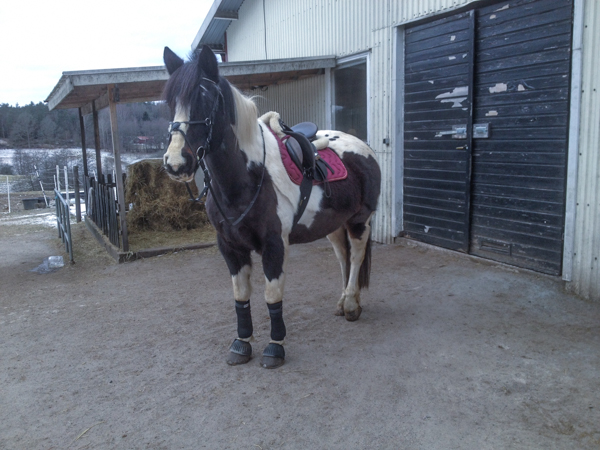 När Alice var ute i hagen igen fixade jag i ordning åt Zita; mockning och foder, och sedan blev även hon pysslad med en stund. Vi tog oss ut i skogen tillsammans med ponnytjejerna och trotsade kylan i över en timme. Vi skrittade nästan hela tiden, travade några enstaka sträckor bara. Det är ju väldigt hårt i backen nu och förrädiska isfläckar här och var så jag håller mig gärna mest till skritt. Det är ändå så sällan man faktiskt är ute och skrittar i över en timme, vilket är synd för det är väldigt nyttigt för hästarna att skritta raskt långa sträckor. Zita var väldigt trevlig att rida idag och hon gick riktigt fint på travsträckorna. Det känns som vi lär känna varandra mer och mer hela tiden! =)