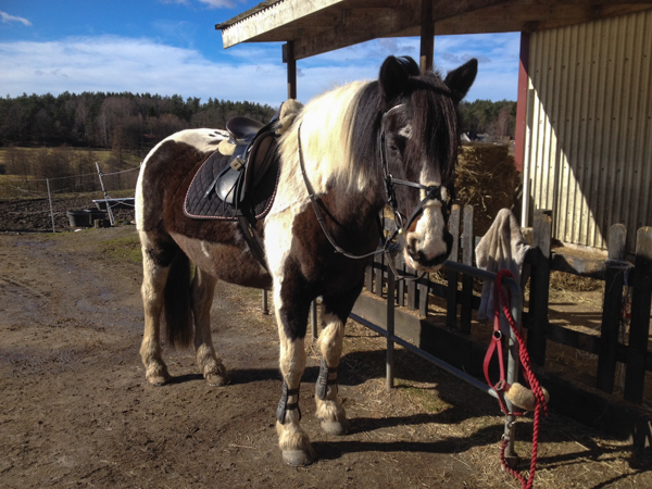 Efter gårdagskvällens oväder var det underbart att vakna upp till solens strålar och fåglarnas kvitter. Även hästarna verkade njuta av vädret och Alice hade nog mer än gärna låtit med fortsätta pysslet i stället för att hämta sadeln. Men så kan vi ju inte ha det! Svansen blev tvättad i alla fall, och säkert 1kg päls försvann i ett nafs.