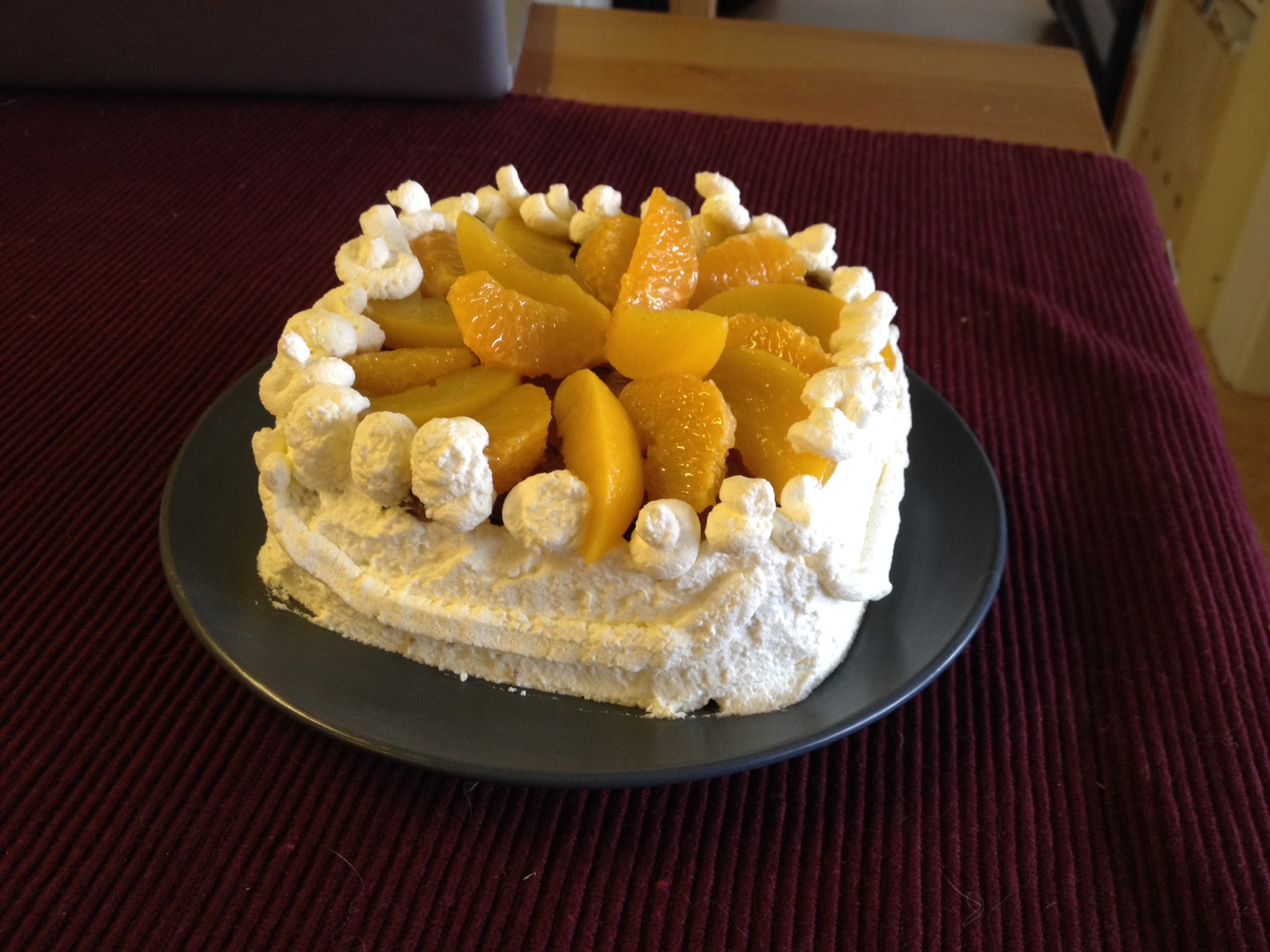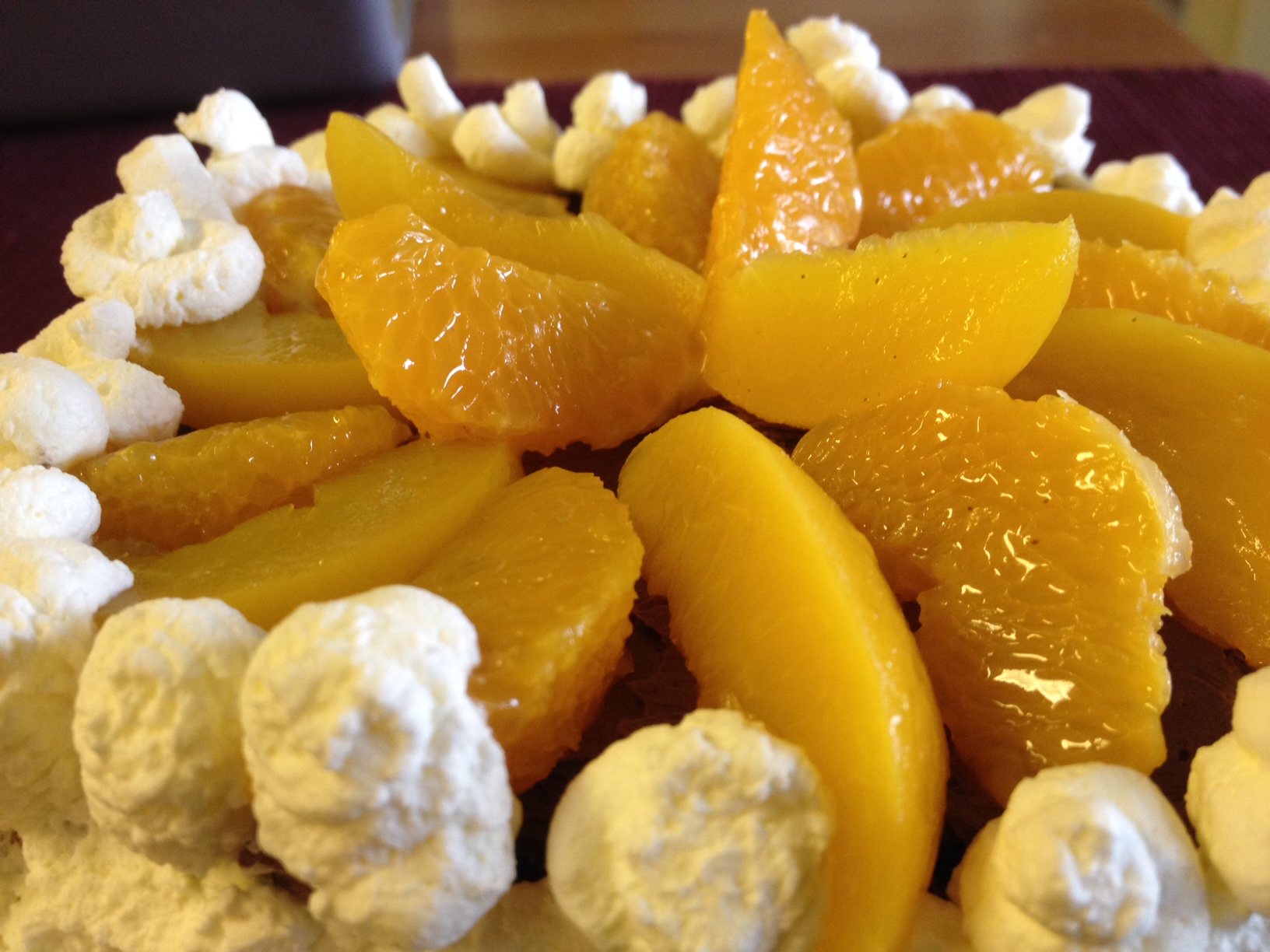 Och till efterrätt skapade vi tillsammans en liten gräddig chokladtårta med clementiner och persikor på! Det ser ut som en stor tårta, men tallriken är av mindre modell!