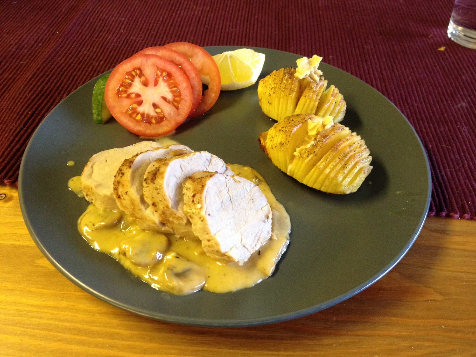 Helstekt fläskfilé på gräddig champinjonsås med hasselbackspotatis och brynt smör.