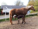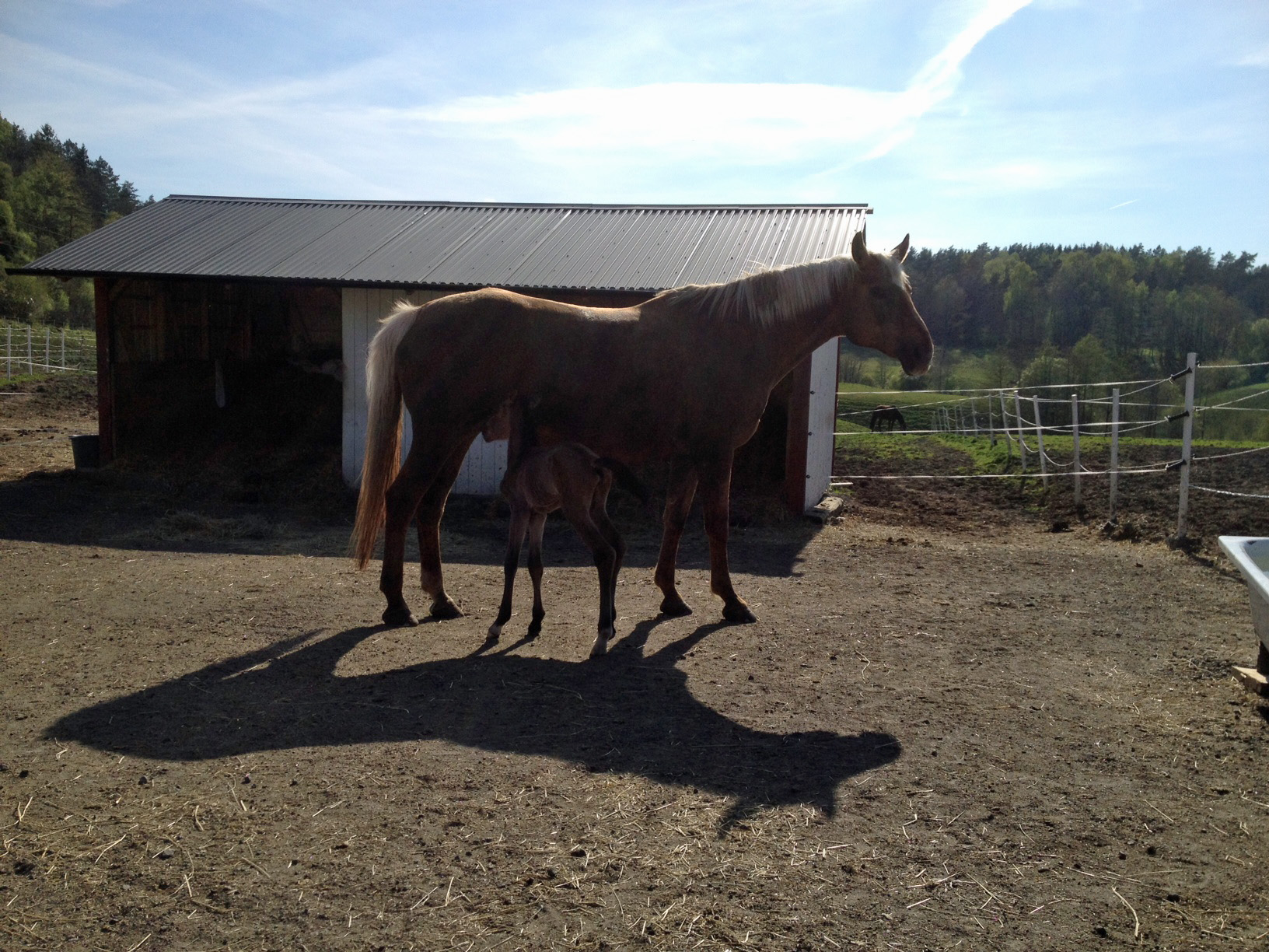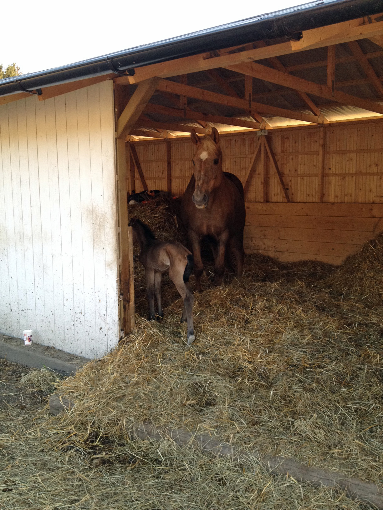 Strax efter tolv i går mitt på soliga dagen stod gårdsherren Johan och rökte på balkongen och blickade ner över sina ägor. Han fick då syn på Blondie som uppförde sig lite udda där hon stod ensam i sin lilla hage framför ligghallen. Hon rusade ut ur ligghallen och sedan in igen och lade sig ner upprepade gånger och stönade så högt så Johan hörde det ända upp till sig. Han förstod ju såklart att det hela var på gång, så han rusade ner till Blondie och gjorde sig beredd för att agera barnmorska. Blondie klarade av hela proceduren själv, och inte långt där efter låg det ett litet stoföl i halmen.