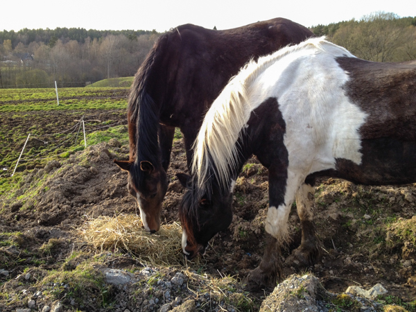 Blondie blir för övrigt tjockare och argare för varje dag som går. I natt fick Sofia ställa mina hästar i en annan hage för Blondie gjorde ordentliga utfall mot dem, trots att hon är instängd i ligghallen nu på nätterna. Blir inte riktigt någon ro för henne att föla då! Så nu går mina hästar i egen hage på nätterna (med både hösilage-bal och en del gräs att äta så de är bara nöjda), och på dagarna går de i samma hage som Blondie fast den är avdelad. Majsen går fortfarande tillsammans med Blondie, hon är högre i rang än Blondie så de går väldigt bra ihop och Blondie blir lite ängslig om hon blir ensam så det funkar bra. Blondie har gått 314 dagar idag och Sofia sa att det kändes som att det var på väg på riktigt i natt, men icke. Helst ska hon ju gå 320 dagar, för innan dess räknas fölet som för tidigt fött och framför allt lungorna på fölet kan vara dåligt utvecklade då det är de som utvecklas sist. Medel brukar ligga runt 335 dagar men det är ju lite olika mellan olika ston, Blondies föl känns ju väldigt färdigbakad!