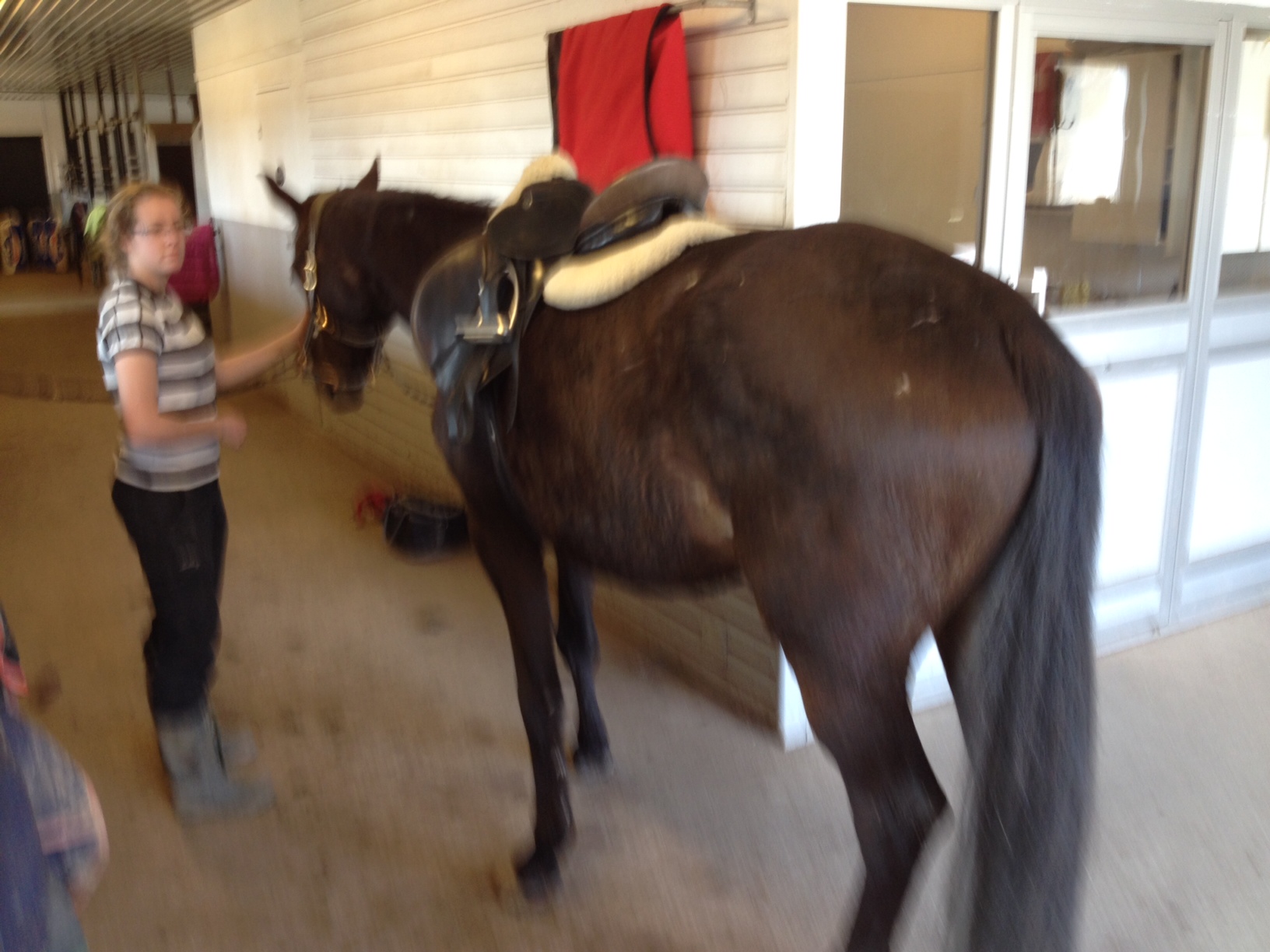 Kaprifol fick komma in i stallet en stund efter promenaden och jag borstade henne ordentligt och så kratsade jag även hovarna hyfsat lyckat trots avsaknaden av mat. Kul att det går framåt! Hon var väldigt avslappnad inne i stallet idag och njöt av rykten så jag tog faktiskt fram Alices sadel och lade den på Kaprifol idag. Hon fick nosa ordentligt på den och så lade jag på den och spände sadelgjorden och hon brydde sig inte nämnvärt. Jag klappade lite på sadeln och ”drog” lite i den och Kaprifol stod lugnt stilla och var mest nyfiken. Duktig! Sen tog jag av den igen, efter att Axel fått ta en bevisbild! Den blev dock väldigt suddig, men den får duga!