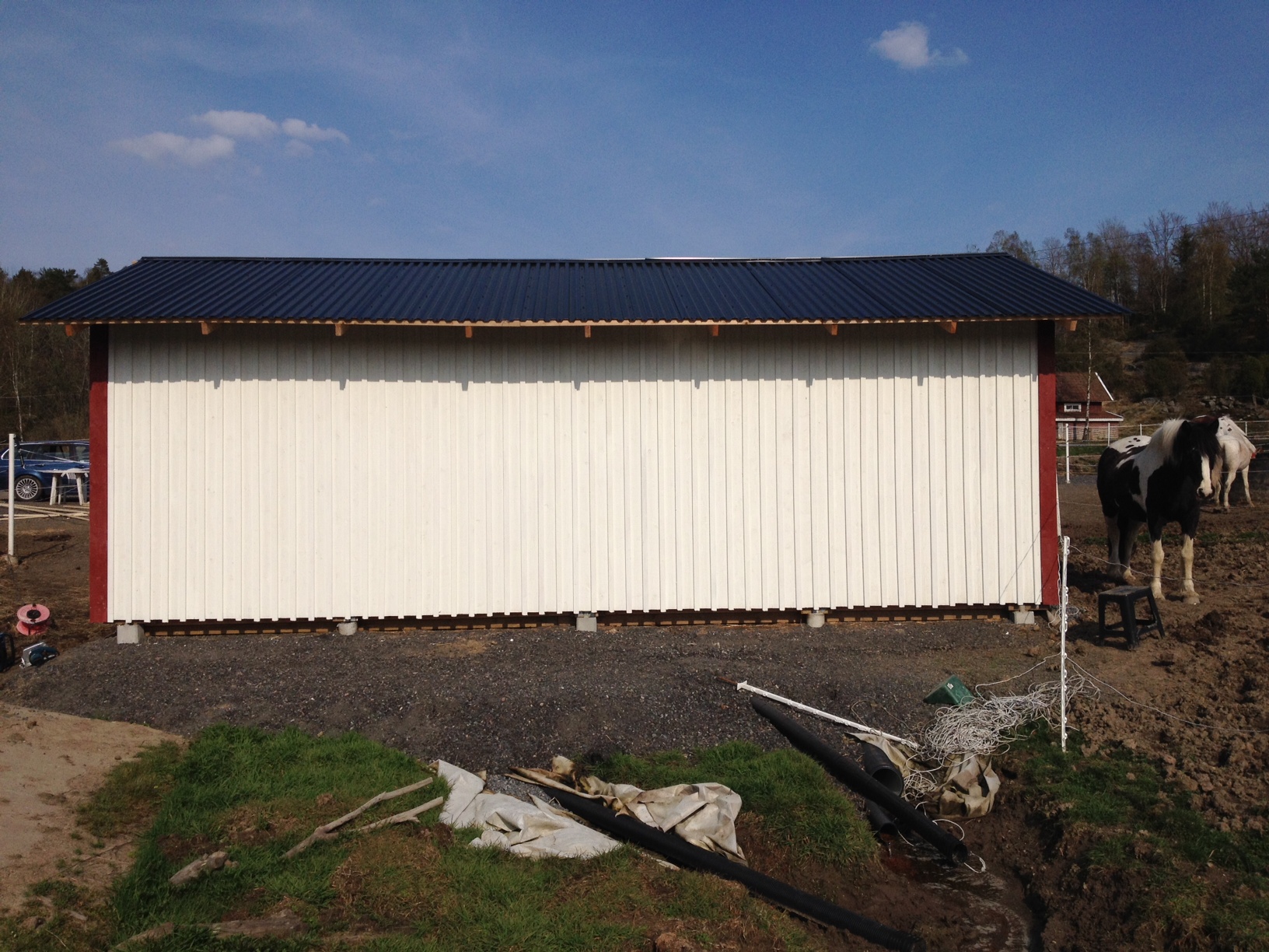 Jag och Axel åkte till stallet tillsammans vid tiotiden eller nåt liknande och efter att jag mockat och Axel plockat fram alla grejer satte vi igång med att spika upp läkt på baksidan av ligghallen. Han spikade, och jag målade! Jag fick även hjälp av två tjejer i stallet, så det gick ganska snabbt och smidigt!