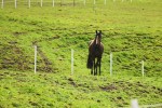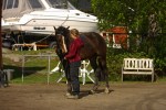 Tömkörningsgjord, träns och tömmar sattes på och sedan gick vi en liten bit längs grusvägen. Jag höll i tömmarna bakefter Kaprifol och Axel gick bredvid henne och bistod i mina kommandon. Vi gick i skritt hela tiden och gjorde ett par halter med rösthjälp och ett lätt tygeltag. Hon gjorde rätt hela tiden, fast det berodde nog inte så mycket på vad jag jag gjorde, utan mer att hon gjorde som Axel gjorde eftersom han gick bredvid. Men man måste ju börja nånstans! Hon var helt lugn med tömmarna som hängde och slängde bakefter henne och hon tyckte heller inte att det var så konstigt att jag gick där bak.