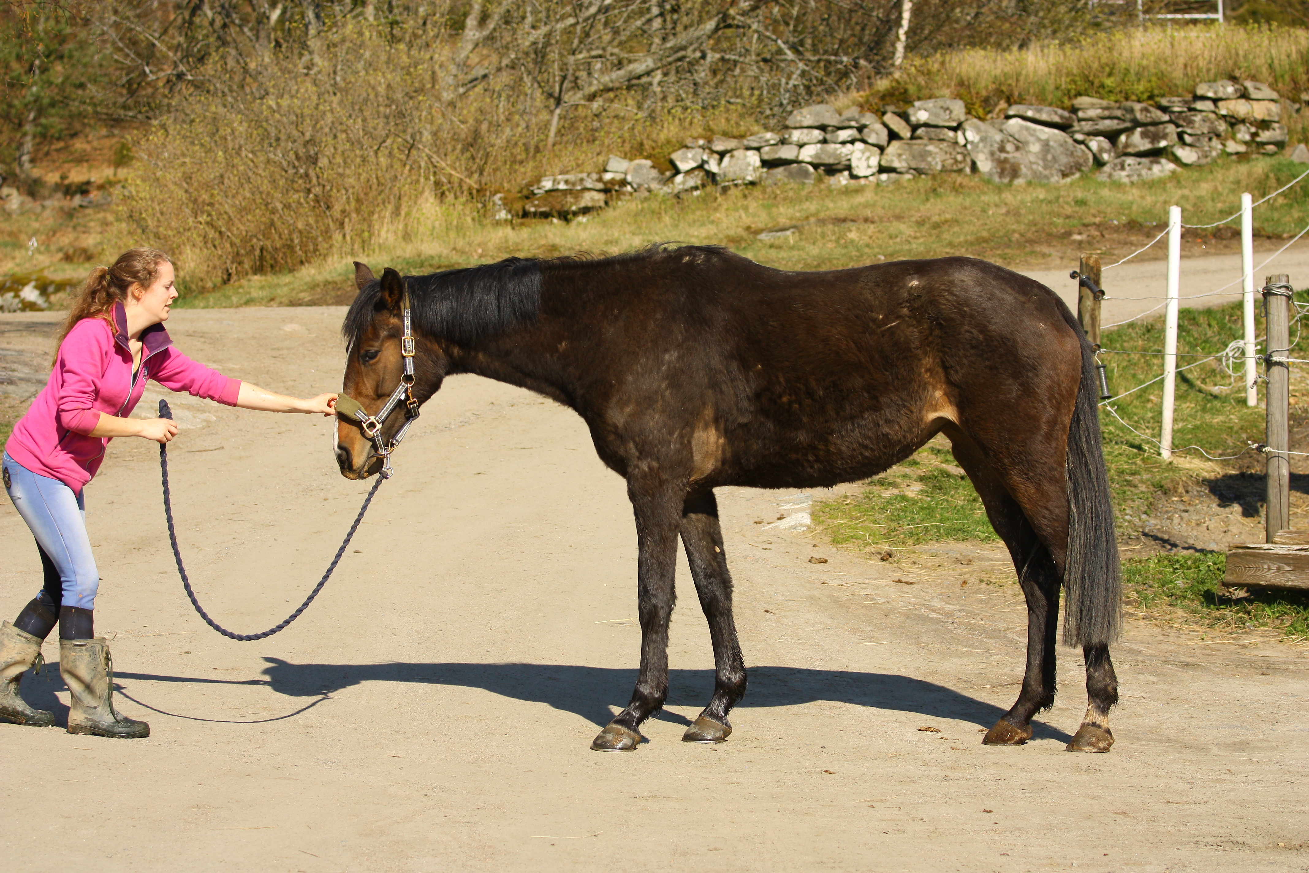Sen tog dock maten slut och den jobbigaste delen av skoningen återstod, nämligen att slå på de nya skorna. Jag hade lite godis att använda mig av och det gick ganska bra faktiskt. Kaprifol ville dra åt sig hovarna några gånger men hon höll sig lugn och relativt stilla. Ett par gånger drog hon sig lite bakåt när hovslagaren höll på med framhovarna, så där så att det ser ut som att hon ska kasta sig bakåt och dra sönder grimman, men det gjorde hon inte utan jag kunde locka tillbaka henne med godis och ett lätt tag i grimskaftet. Hon höll sig lugn hela tiden och stressade inte upp sig, vilket var skönt. Så på det hela taget en ganska duktig häst som säkert kommer göra det ännu bättre nästa gång! Min hovslagare är ju väldigt bra också; lugn och säker och klappar gärna på hästarna lite då och då.