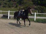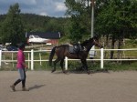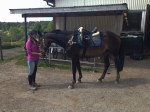 Axel var med mig och vi sadlade Kaprifol, satte på henne mitt ”säkerhetsbälte” (förbygel med en rem över mankammen som jag kan hålla mig i, hittade den på blocket!) och så tog vi med henne ut i paddocken. Först släppte vi lös henne en stund så hon skulle få springa av sig eventuell energi men hon verkade lugn och fin så vi fångade henne ganska snabbt igen. Vi parkerade henne bredvid en pall, Axel höll i henne samt höll emot i sadeln på ena sidan och jag ställde mig på pallen. Började först lite som jag gjort tidigare genom att hänga på henne och klappa henne på baken, sidorna och röra lite i sadeln. Hon tog det med ro så jag satte ena foten i stigbygeln och ställde mig i den – ingen reaktion – jag hängde mig över henne med hela min tyngd – ingen reaktion – jag lyfte mitt högerben över henne och satte mig i sadeln. Ingen reaktion! Sjävklart hade Axel lite godis i fickan som hon fick smaska på. Jag klappade henne på halsen och kliade henne och pratade med henne och sedan satt jag av igen bara för att upprepa hela proceduren en gång till.