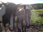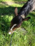 Det gick ändå ganska bra. Testade med slangen först men det gillar hon inte alls så jag gick över till hink och svamp. Efter ett par tillrättavisningar när hon sprang runt mig så stod hon helt stilla med hängande grimskaft medan jag svampade av benet. Det var ju inte så farligt visade det sig. Kan ju inte säga att jag är glad över att hon har fått mugg, men nu blir vi ju så illa tvungna att tvätta det varje dag så då lär vi ju lära oss att det inte är farligt på köpet!