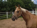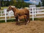 De stod stilla och fint hela vägen in till Ale och där fick de vänta i en hage tills de var vår tur. Då gick vi in i ”halt-gången” så veterinären kunde se hur fölet rörde sig och han var mycket nöjd med utvecklingen sedan förra besöket. Därefter fick vi gå in i en stor gummi-vadderad undersökningsbox och veterinären filade lite lite på fölets hovar för att hjälpa till med benställningen samt kontrollera att den lilla hjälpande plastbiten på framhoven satt som den skulle. I övrigt gjorde han inte så mycket mer än att lyssna på hjärtat och känna lite på fölets kropp, han var nöjd och fölet behövde alltså inte få på sig sin specialsko igen som hon gått med till och från de senaste veckorna. Skönt! Nu blir det återbesök om tio dagar och tills dess ska de gå i hage och röra på sig lite lagom!
