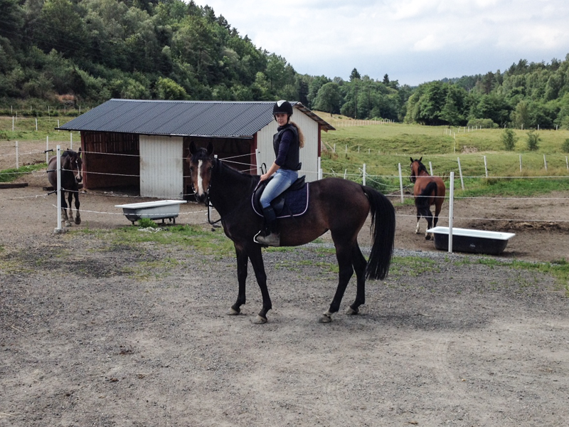 Hästarna verkade inte vara trötta sen igår utan skrittade på med god fart. Vid ett tillfälle fick Kaprifol för sig att hon skulle vända hemåt (vi som tidigare haft omvända problemet..) så där stod vi en stund och diskuterade saken och vi kom snart på rätt väg igen. Lite trav blev det också och det kändes riktigt bra! Börjar vänja mig vid hennes sjumilakliv nu. =)