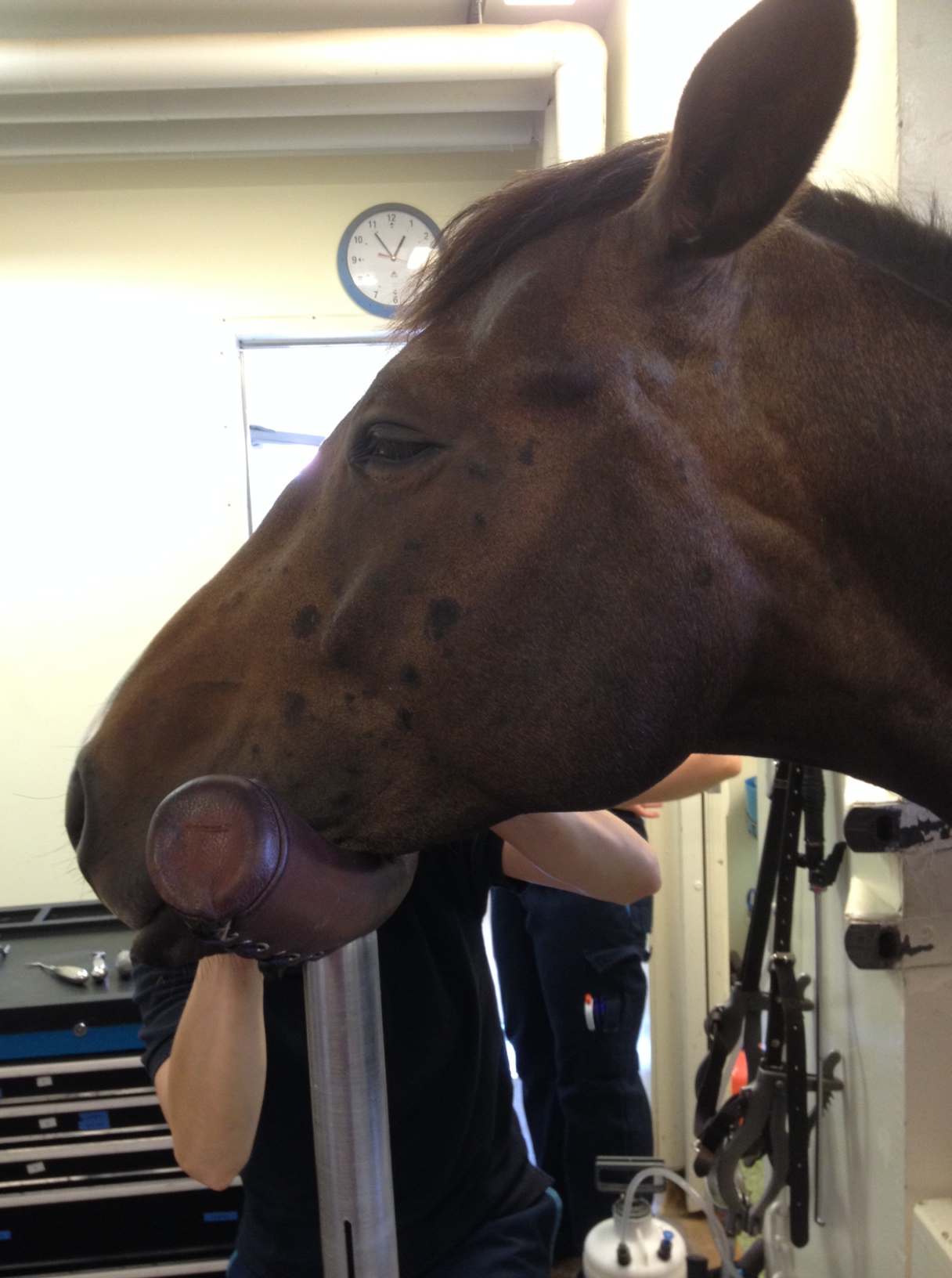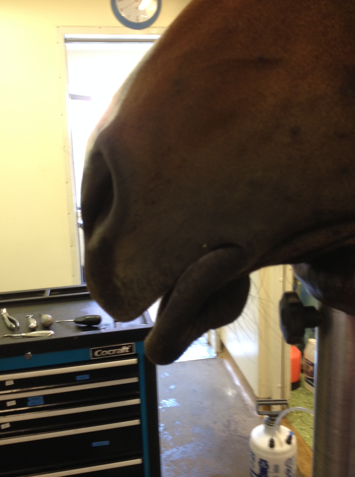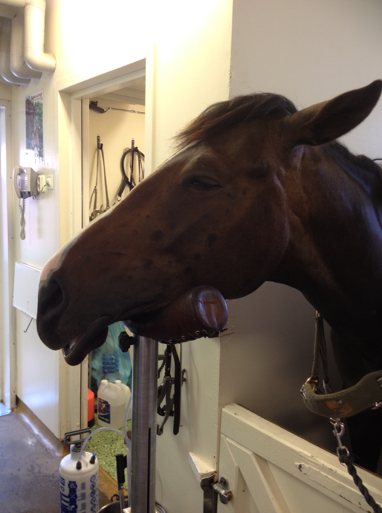 Väl framme i Ale efter 40 min resa öppnade vi hos henne direkt. Höet var nästan slut och hon var aningens nervös men inte så farligt. Det tog en liten kort stund innan jag fick henne att backa ut men när hon väl gjorde det gick hon lugnt och fint ut. Av med skydden och sen fick hon komma in i en liten rasthage medan vi gick och anmälde vår ankomst i receptionen. Hon var lite nervös även här och gick runt i hagen och gnäggade efter oss när vi gick till receptionen men hon var inte stressad eller så. Efter kanske en kvart fick vi komma in i undersökningsrummet och Kaprifol fick gå in i en spilt-box där hon stod relativt lugnt. Veterinären kände lite utanpå munnen och lyssnade sedan på hennes hjärtslag innan hon fick en liten dos lugnande och lokalbedövning där vargtänderna satt (för det var faktiskt två och inte bara en).