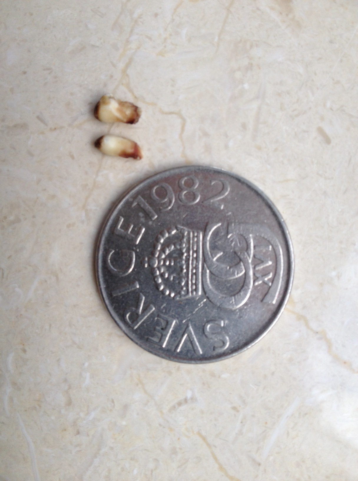 Själva tänderna var ju inte mycket att hänga i julgranen, jag visste att de skulle vara små men så här små!? Även veterinären tyckte att de var väldigt små, men det är också så att ju mindre de är desto mer obehag ger de så hon tyckte det var väldigt bra att ta bort dem.