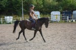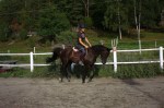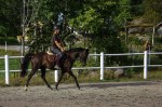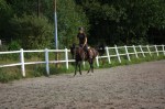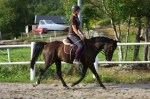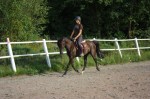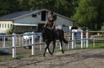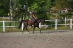 Jag skrittade fram Imagine ordentligt på grusvägen innan jag gick in i paddocken där jag började trava direkt. Imagine har lite problem med framåtbjudningen i början av ridpasset men det blir mycket bättre om man skrittar fram henne utanför paddocken samt låter henne jogga runt en stund utan några som helst krav i början. Så jag travade runt i stora bågar med endast ett lätt stöd i handen och lät henne komma igång i kroppen.