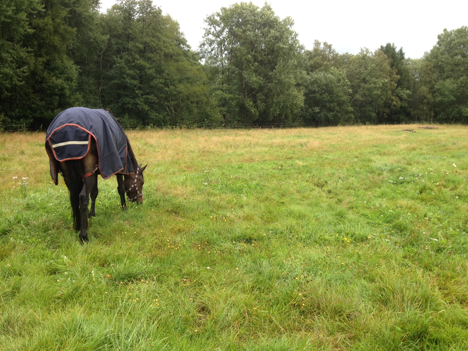 Jag och en tjej till bytte hage på hästarna i dag och hej och hå vad himlen öppnade sig! Det tog inte många minutrar att leda hästarna en liten bit längs grusvägen och släppa dem i den nya hagen men det räckte för att regnet skulle leta sig in under kläderna. Hästarna blev glada över lite mer mat och tyckte det var skoj med ännu en ny hage. Det är min vattenvecka denna veckan så när hästarna var i hagen åkte jag upp till stallet och fyllde vattendunkarna och ställde vid hagen så jag har att fylla på med senare i veckan. De dricker inte speciellt mycket nu, men nåt ska det väl gå åt!