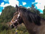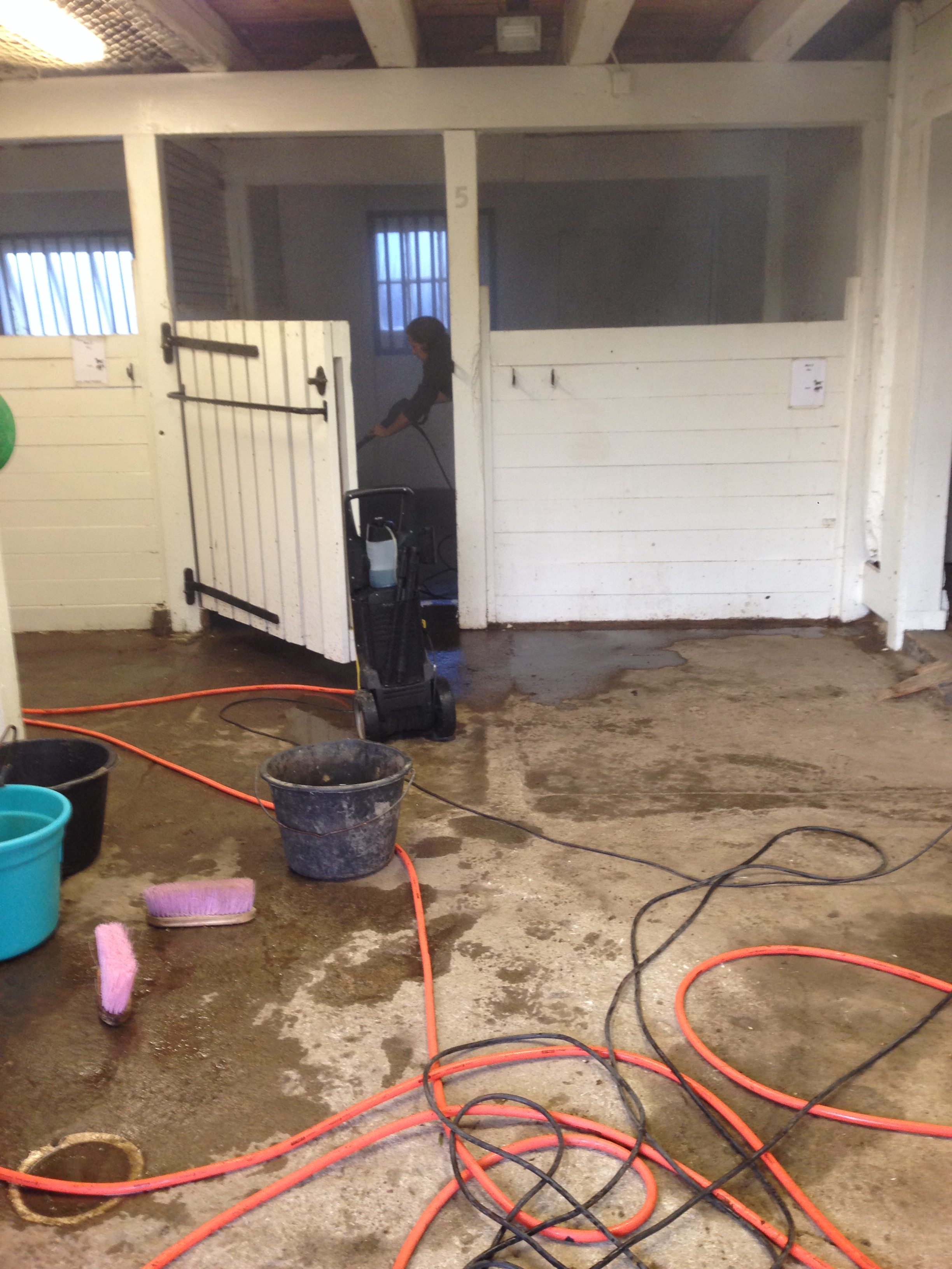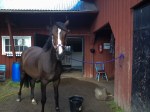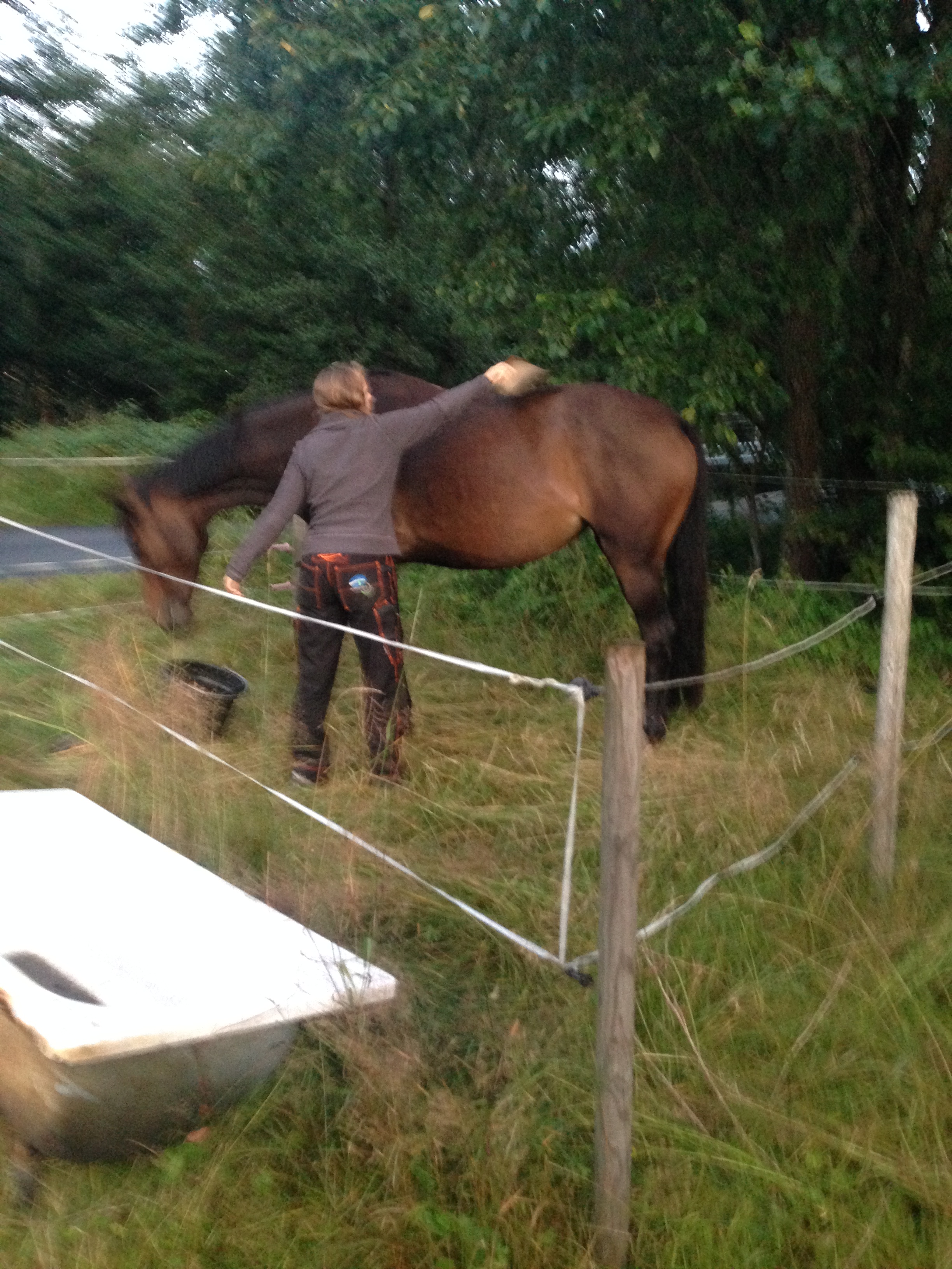 Jag och en tjej till bytte hage på hästarna i dag och hej och hå vad himlen öppnade sig! Det tog inte många minutrar att leda hästarna en liten bit längs grusvägen och släppa dem i den nya hagen men det räckte för att regnet skulle leta sig in under kläderna. Hästarna blev glada över lite mer mat och tyckte det var skoj med ännu en ny hage. Det är min vattenvecka denna veckan så när hästarna var i hagen åkte jag upp till stallet och fyllde vattendunkarna och ställde vid hagen så jag har att fylla på med senare i veckan. De dricker inte speciellt mycket nu, men nåt ska det väl gå åt!