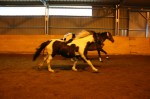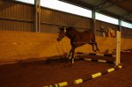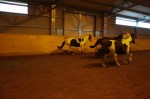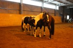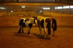 Framme vid ridhuset funderade vi ett slag på hur vi skulle göra med hästarna, om vi skulle våga släppa alla lösa eller inte eftersom Alice är helt ny i gänget och Kaprifol bara har gått med Moonshine tidigare. Vi gjorde så att vi lät hästarna hälsa på varandra medan vi höll i dem och eftersom det gick väldigt bra släppte vi helt enkelt alla fyra hästarna lösa i ridhuset. Det hade inte kunnat gå bättre måste jag säga. Ni skulle sett! Till en början gömde sig Alice bakom Kaprifol och de travade i takt, sida vid sida runt runt i ridhuset och bytte varv med jämna mellanrum. Men sen hälsade de lite mer på de nya hästarna och plötsligt var Alice bästa kompis med Moonshine, det andra skäckstoet. Förutom Kaprifol har jag nog aldrig sett henne ”bonda” så med en annan häst så snabbt. Mr Niceguy höll sig lite för sig själv och vi började löshoppa honom eftersom de andra tre hästarna i princip vägrade gå i från varandra. De stod sida vid sida alla tre medan vi löshoppade Mr N.