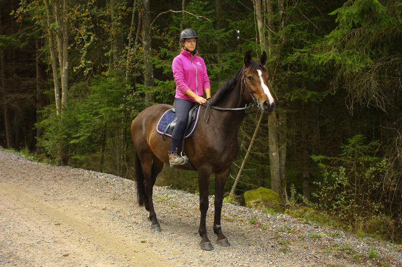 Det blev min och Kaprifols längsta ridtur någonsin, 5,5 kilometer var rundan och vi skrittade hela vägen så det tog nog närmare 1.5h att rida runt. Kaprifol har skött sig perfekt och hon orkade gå hela rundan utan problem! Och vilken runda sen! Fina grusvägar, tallbarrsstigar, sandstigar och så touchade vi kanten av ”galoppbanan” som jag lätt kommer tillbringa en del tid på. Galoppbanan är en sandad slinga i skogen, 600m lång och i princip helt oval. Här kan man alltså galoppera runt, runt och träna upp ordentligt med flås på hästen utan att behöva oroa sig för att träffa på bilar eller mycket annat. En och annan älg kanske =)