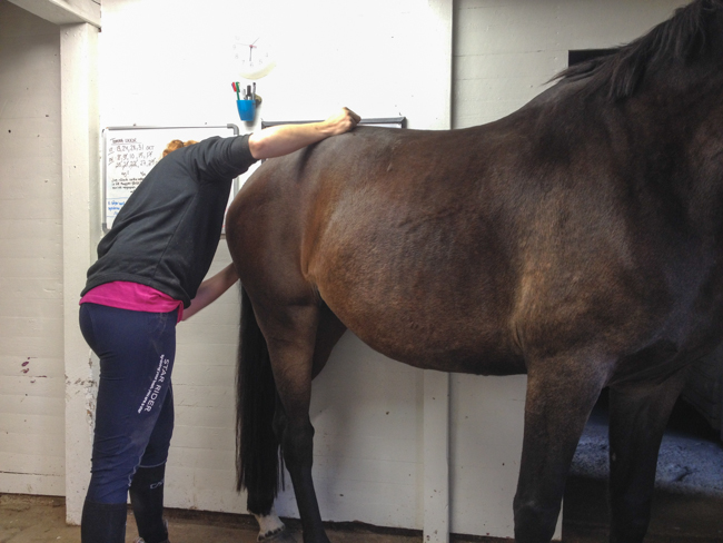 När vi var tillbaka i stallet var massören precis klar med Pondus så jag släppte snabbt ut Alice i hagen och hämtade in Kaprifol. Det tog massören en timme att gå igenom Kaprifol ungefär, och Kaprifol var jätteduktig hela tiden och stod stilla. Nån gång då och då vevade hon lite med ett framben, men i övrigt stod hon stilla och njöt. Massören tyckte att hon kändes mjuk och fin och liksidig vilket var roligt att höra. Men det hade ju varit lite pinsamt om jag redan lyckats sned-rida henne… 😛