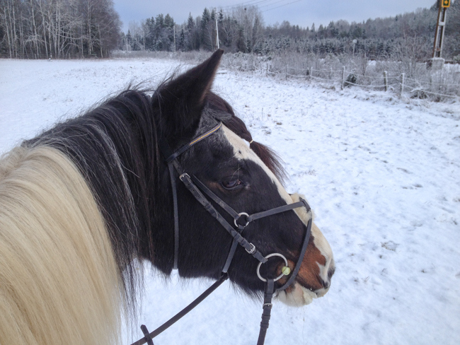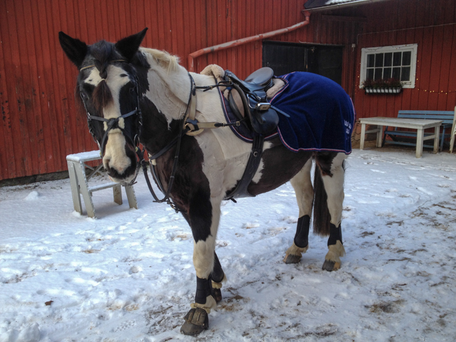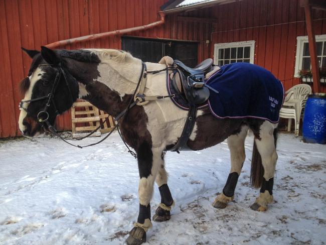 Efter stallsysslorna plockade jag in Alice och gjorde i ordning henne inför ridtur. Efter snöns ankomst blev det också till att brodda. Med tanke på utseendet på broddarna och åldern på skorna så gick det förvånansvärt smidigt. Broddade dock bara fram idag, då jag tänkte hålla mig i en av de snötäckta sommarhagarna!