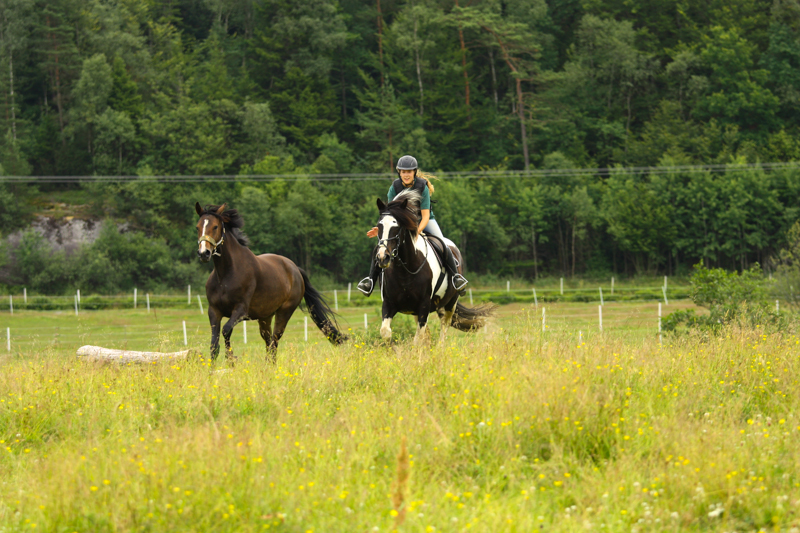 När de busat färdigt och lugnat sig gick jag lite med dem i hagen och sen gjorde jag ett nytt försök med att rida Alice och ha Kaprifol som handhäst och nu gick det genast lite bättre så vi skrittade en liten omväg tillbaka till stallet så de fick skritta av sig ordentligt. Därefter fick de torra täcken på sig och komma ut i hagen igen med lite hö. Nöjda hästar!