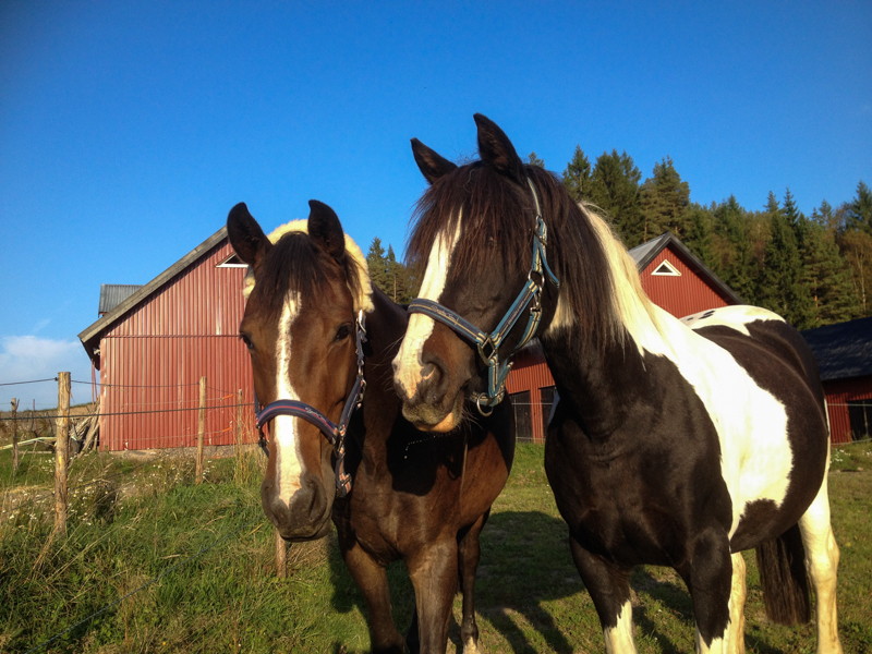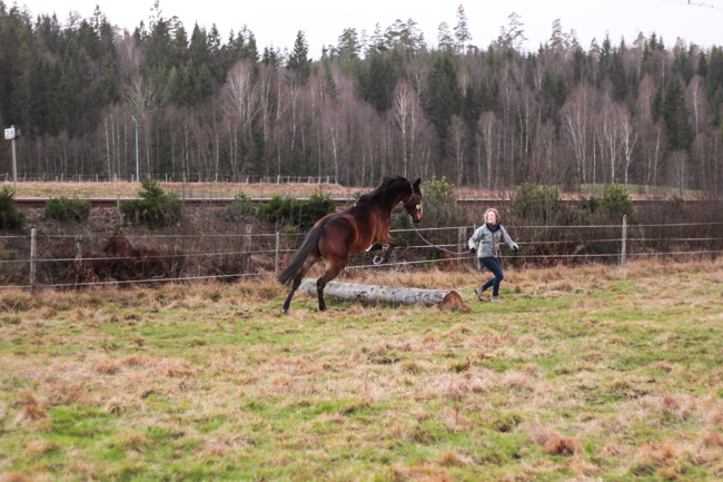 Kaprifol var lite mera taggad, så jag höll mig själv nere på backen idag också och tog med mig henne ner till gläntan i grimma och longerlina. Först fick hon busa av sig lite energi och sedan longerade jag henne i skritt och lite trav och tränade lite lydnad. Hon fick även gå över ett par ”cavalettibommar” (pinnar) och skutta över ett pyttelitet hinder byggt av två stubbar och en liten trädstam. =)