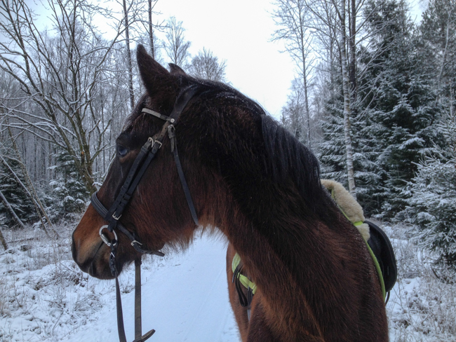 Kaprifol känns toppen nu, hon har fått rasta av sig ordentligt den här veckan samt fått jobba lite på töm och idag red jag ut tillsammans med Malin. Det blir helt klart en stor skillnad att rida henne när hon inte är övertaggad, och idag var hon riktigt fin på uteritten och höll sig på backen hela rundan. Vi travade två längre sträckor över de snötäckta vägarna och det gick prima. Hon har även fått erfara broddar för första gången i sitt liv, men det verkar inte bekymra henne märkvärt.