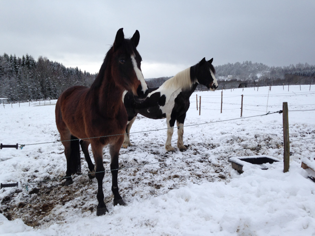 Jag hade även insläppet idag så passade på att mocka lite extra noga, packa extra hö och smörja lite läder innan klockan blev åtta och jag släppte in hästarna till sina boxar. Nu när det är ett par minusgrader har vi värmekabel till vattnet inne i stallet och lock på vattentunnorna i hagen över natten, i övrigt gör vi ingen extra. Hästarna klarar kylan finfint så stalldörrarna är ställda på glänt för bra luft, det är bara vattnet som behöver lite extra omtanke.