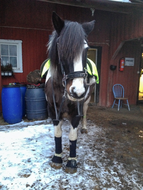 Kaprifol fick en promenad idag efter gårdagens lite tuffare träningspass. Hon var inte ett dugg trött utan tyckte mest det var lattjo att traska fram ensam med mig på den mörka grusvägen. Jag fick påminna henne ett par gånger att man inte får dra iväg hur som helst, och då försökte hon med konststycket att småtrava bredvid mig på tvären, utan att dra det minsta i grimskaftet. Jo ja, men det var ju inte riktigt det jag menade, jag ville att du skulle gå lugnt och fint bredvid mig! 🙂