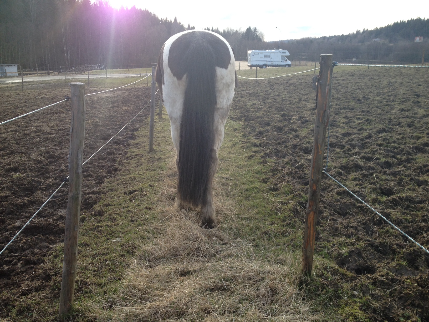 Båda hästarna fäller som attans nu, hur härligt som helst måste jag säga! För Alice del gjorde jag två flugor i en smäll, hon fick nämligen beta i gången mellan två hagar (varav den ena är tom) medan jag gick efter och drog av lös päls. Såg ganska kul ut, det blev som ett spår av snö efter oss. Hon fäller även det bruna nu, men det syns ju inte lika väl som det vita.
