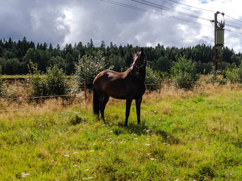 Kaprifol kändes lika fin som hon var igår och följde min minsta vink i både skritt och trav. Jag gjorde en del mindre volter runt stockarna, red slalom och tränade lite övergångar mellan skritt och trav vilket gick OK. Jag tog även lite galopp i båda varven och det är en riktigt härlig känsla att galoppera fram över gräset i hennes underbara, stora galopp! Ibland tvekar hon lite och då går galoppen mer uppåt än framåt, men efter lite uppmuntran sätter hon fart igen. Hon blir dock trött ganska så snabbt tycker jag, eller så tycker hon själv bara att vi var färdiga, för efter galoppen var hon väldigt ovillig att svänga bort från hem-hållet plötsligt. Jag fick bli lite arg på henne en gång, och då fick hon ny energi och travade glatt på igen. Som avslutning travhoppade vi en av stockarna två gånger och det kunde verklige inte varit enklare! Hon bjöd fint, hoppade över, landade i rund och fin galopp och saktade av till trav efter några språng när jag bad henne! Såå duktig! Verkade som om hon tyckte att det var roligt också.